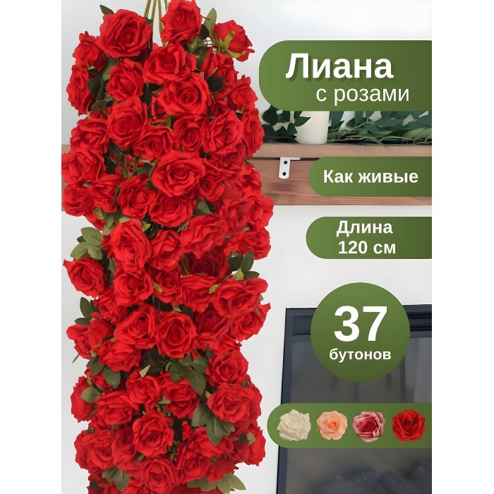 Цветы искуственные Розы каскадные (37 штук, 120 см, цветок 10 см) красный 265903