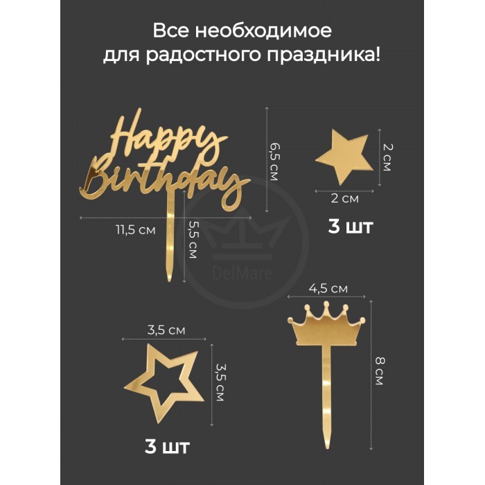 Топпер зеркальный Happy birthday (Корона/палочка 1 шт, Звезда 3 шт), золото 266157