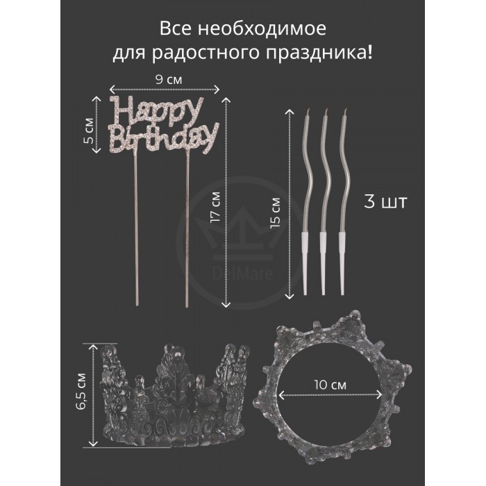 Корона на торт прозрачная+топпер Happy birthday (1шт) +Свечи (3 шт), серебро 266161